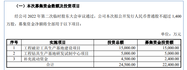 本次IPO,恒立钻具拟申请向不特定合格投资者公开发行不超过 1,400 万股(含本数,不含超额配售选择权)股票,每股发行价格不低于16元,募集资金2.24亿元,用于工程破岩工具生产基地建设项目、工程钻具生产基地研发试制中心项目和补充流动资金。